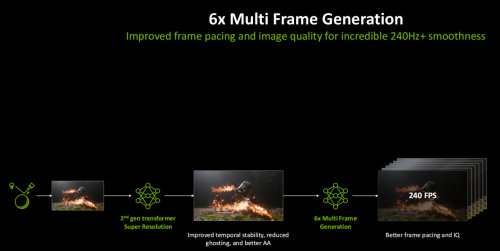 同时,DLSS 4.5采用了全新的动态多帧生成技术,相比DLSS 4的4倍多帧生成,它最高支持6倍多帧生成,可以大幅提升游戏流畅度,同时也能按照当前显示器的最高刷新率设置,以刷新率为帧率输出目标实时动态调整多帧生成,让最终帧率呈现与显示器刷新率设置保持一致。