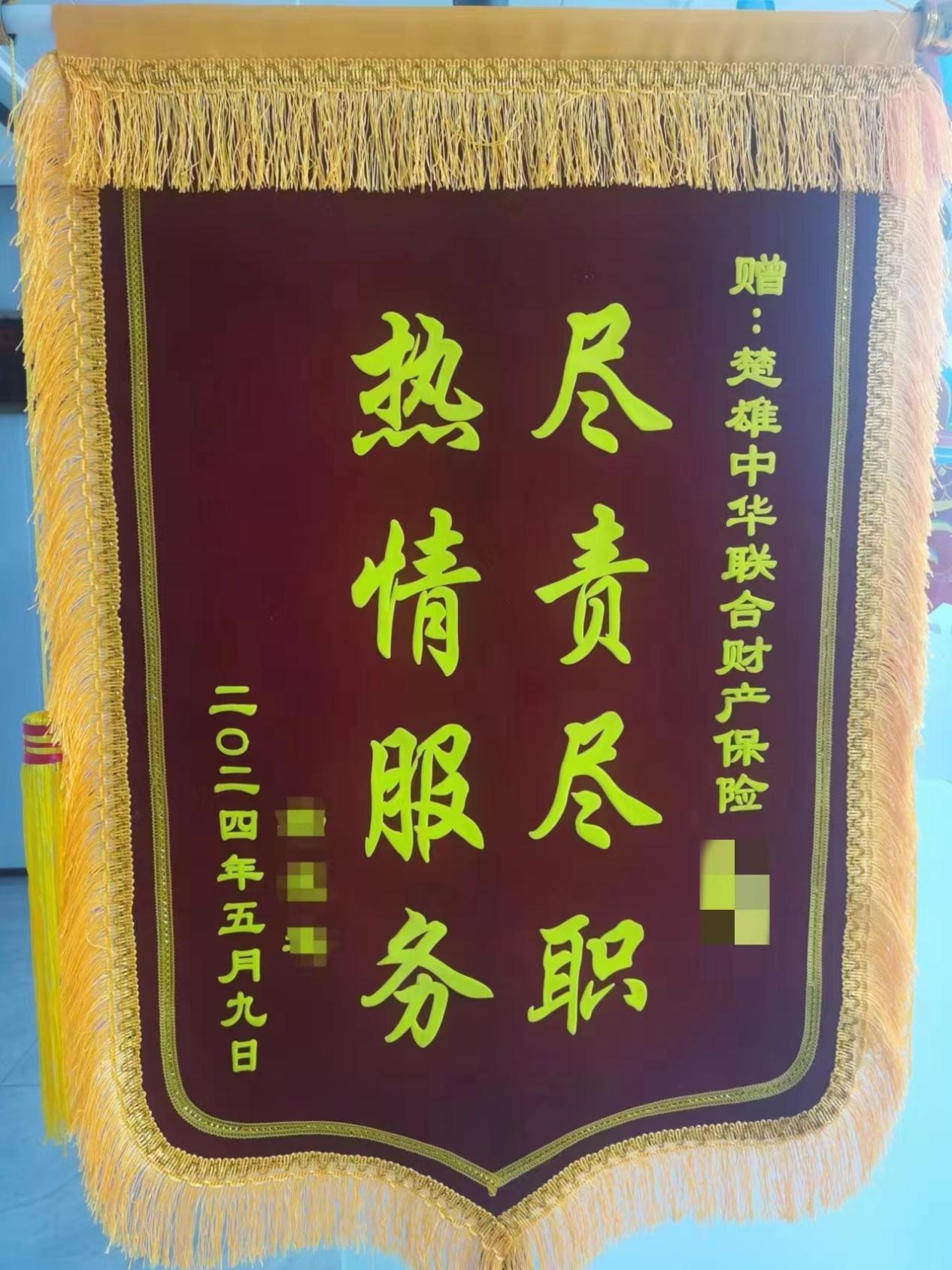 近期,中华财险云南楚雄中支收到客户杨先生上门赠送的“尽职尽责 热情服务”锦旗一面。锦旗上的八个字凝聚了客户杨先生对中华财险理赔人员的认可和感激。