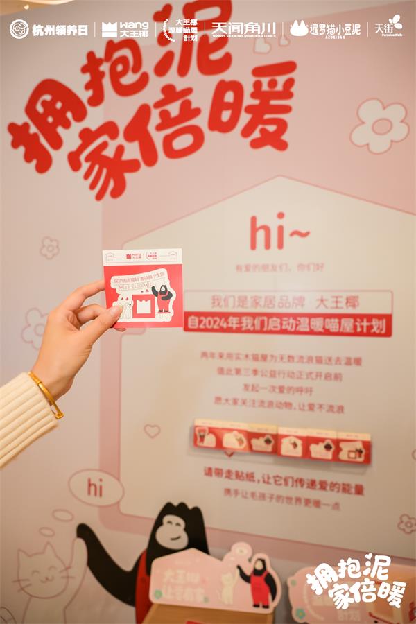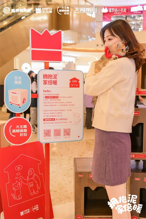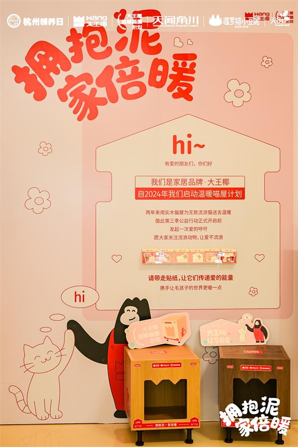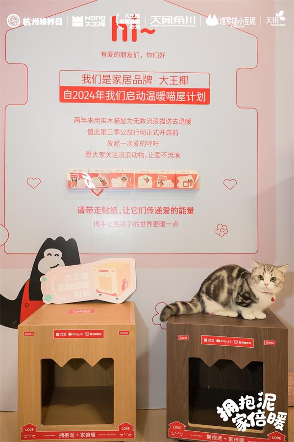 11月22-23日在杭州西溪天街,家居品牌大王椰联合杭州领养日、人气IP暹罗猫“小豆泥”,发起「拥抱泥,家倍暖」温暖公益行动。活动以实木猫屋捐赠、流浪动物领养、爱心义卖为核心,通过巨型猫屋打卡点、爱心墙互动、联名周边发放等环节设计,将品牌环保板材与流浪动物救助结合,打造人宠共居的温暖场景。此次快闪既是品牌公益IP“温暖喵屋计划”第三季的预热,也是大王椰“饰面美学大师”战略的场景化落地——用公益行动传递品牌温度,以美学设计强化产品价值。