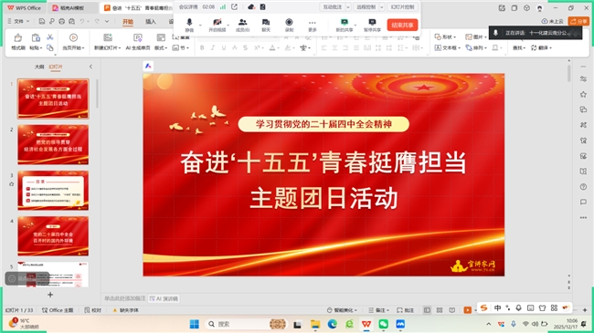 当时代的浪潮奔涌至“十五五”的新航道,党的二十届四中全会的胜利召开,为中国未来五年的发展标定了航向。为让青年员工深刻领会全会精神,将个人的成长与分公司的发展、国家的战略同频共振,12月17日,中国化学工程第十一建设有限公司云南分公司开展“奋进‘十五五’ 青春挺膺担当”主题团日活动,分公司副总经理、纪检委员李佳佳,团总支副书记周启航与全体青年团员齐聚一堂,在学习与交流中,凝聚青春奋进的共识。