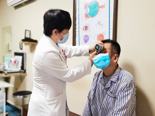 (李秋梅主任为贾先生复查眼压)