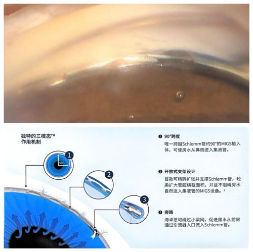 “传统外引流手术如同在眼球外新建‘排水渠’,创伤大且易引发瘢痕增生,不适合贾先生这类复杂青光眼患者。”李秋梅主任解释说,海卓思技术通过微小角膜切口植入,无需制作结膜瓣或巩膜瓣,能够精准支撑并扩张眼部天然排水管道Schlemm管。通过小梁网旁路、管腔支架扩张和90°范围覆盖的三重引流机制,高效恢复房水自然引流功能。