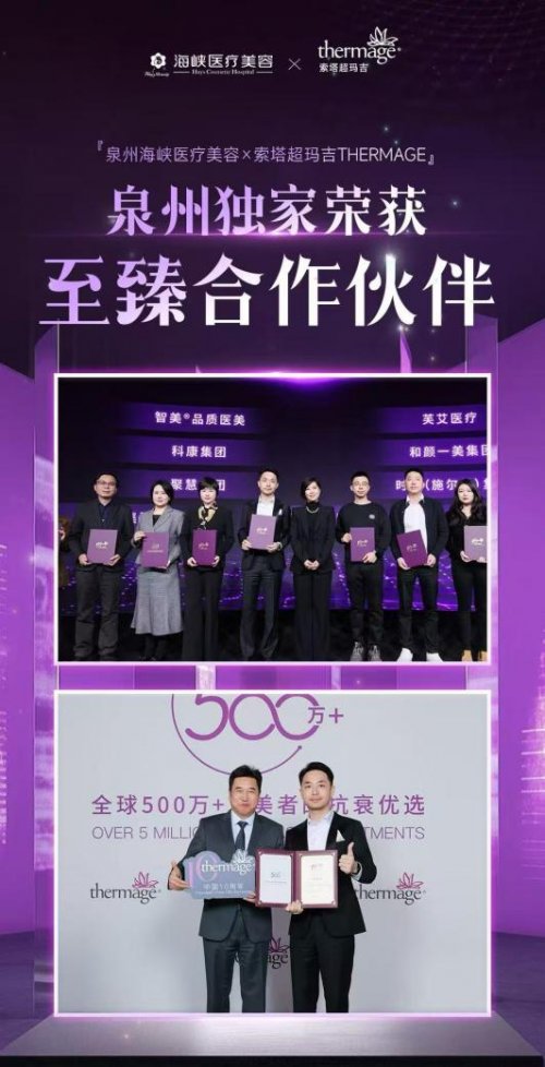 12月11日,泉州海峡整形副总经理廖福汉以特邀嘉宾身份受邀出席索塔Thermage超玛吉中国十周年庆典,作为泉州市唯一一家出席本次国际盛典的官方认证医疗美容品牌,泉州海峡医疗美容以及海峡医疗美容医院集团荣获《索塔超玛吉Thermage至臻合作伙伴授证》,并成为索塔超玛吉全球500万+求美者纪录的共同见证者。
