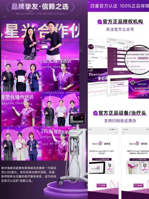 泉州海峡整形作为索塔Thermage超玛吉官方认证合作机构,其资质可在相关认证平台公开查询。在官方发布的验真流程中,求美者可通过官方公众号实时查验机构首选、设备授权、认证有效期及治疗范围等关键信息。这一规范化、透明化的验真机制,为求美者选择安全、合规的医疗美容服务提供了重要参考,在合规运营与医疗质量建设上泉州海峡整形将持续投入,为求美者提供更高水准的产品和服务